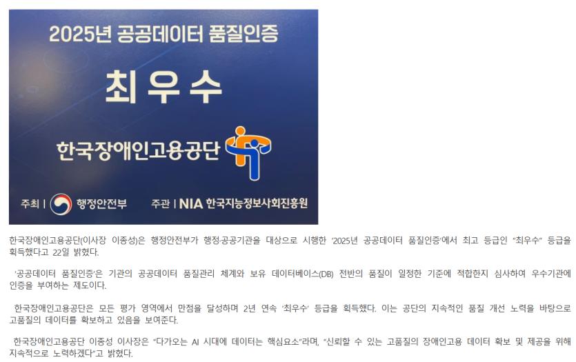 한국장애인고용공단(이사장 이종성)은 행정안전부가 행정·공공기관을 대상으로 시행한 ‘2025년 공공데이터 품질인증’에서 최고 등급인 “최우수” 등급을 획득했다고 22일 밝혔다.
