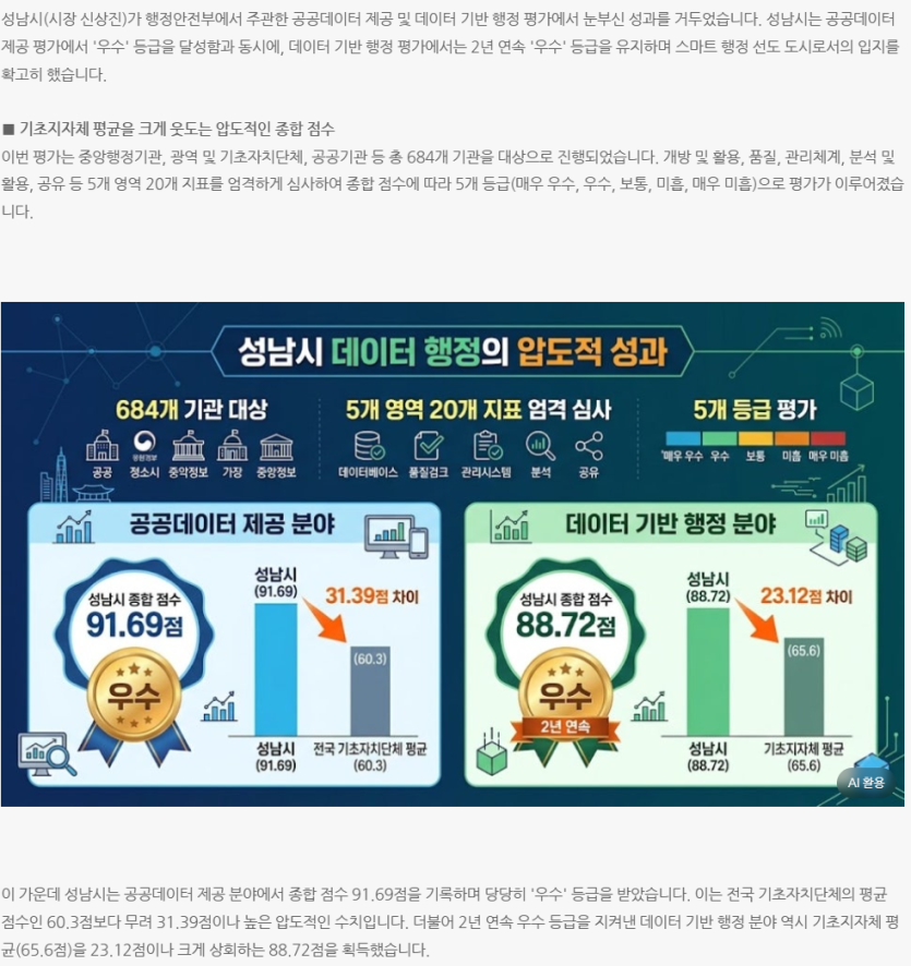성남시 공공데이터 제공 '우수', 데이터기반행정 2년 연속 '우수'