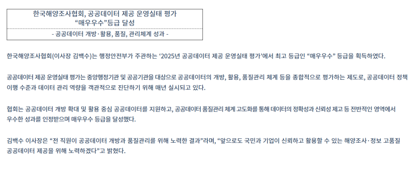 한국해양조사협회 공공데이터 제공운영실태 평가 '매우우수' 등급 달성
